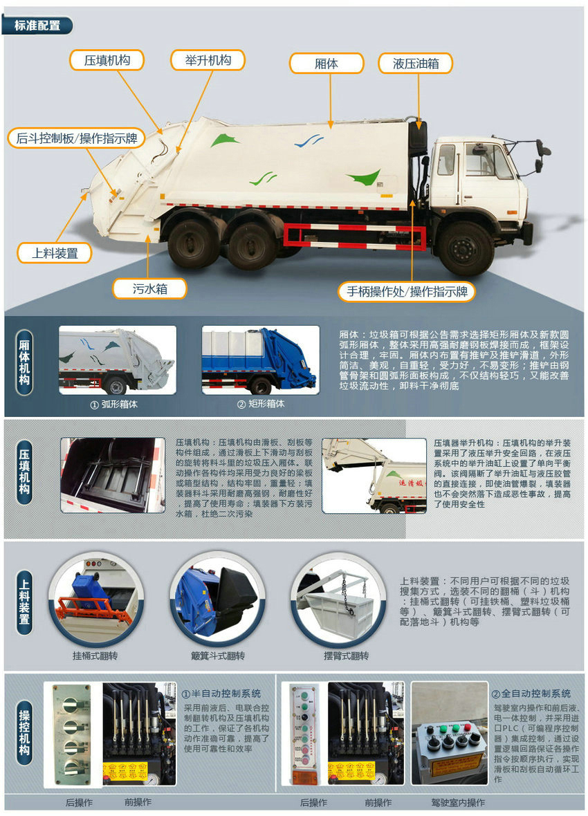 標(biāo)準(zhǔn): 壓縮式垃圾車:采用機(jī)、電、液聯(lián)動(dòng)控制系統(tǒng)、電腦控制及手動(dòng)操作系統(tǒng),通過填裝器和推鏟等裝置實(shí)現(xiàn)垃圾倒入、壓碎或壓扁,并將垃圾擠入車廂并壓實(shí)和推卸。